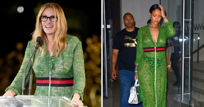 Кажется, для актрисы выбор цвета и модели платья оказался не самым удачным. А вот Рианне платье от Gucci пришлось в пору. Даже брендовые вещи подходят не каждому.