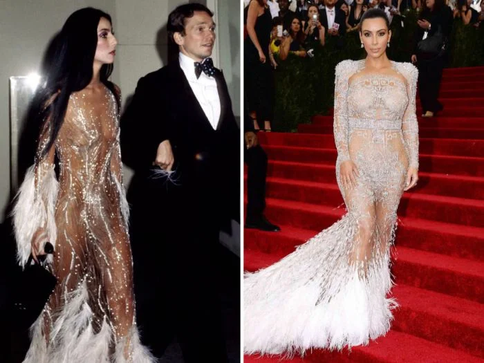 Платье Ким хоть и не точная копия культового образа Шер с Met Gala 1974 года, но с явной отсылкой на него. На певице платье сидит изящней и выглядит воздушней, чем на американской предпринимательнице.
