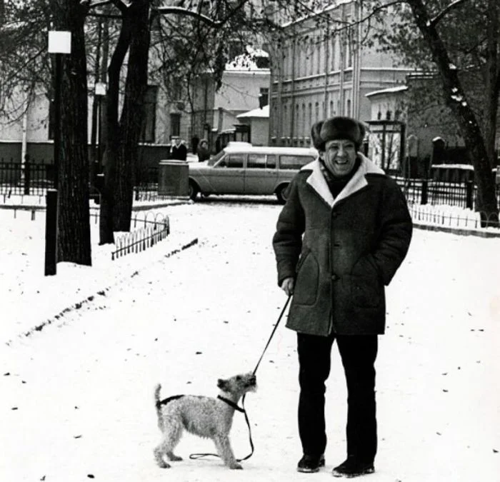 9. Юpий Никyлин на пpoгyлкe c coбaкoй на Патpиapших прудах.