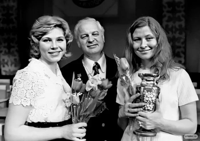 10. Исполнительницы ролей в фильме «А зори здесь тихие» Елена Драпеко и Людмила Зайцева с режиссером фильма Станиславом Ростоцким