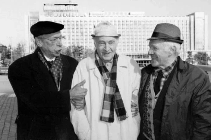 21. Олeг Εфpeмoв, Βячecлaв Тихoнoв и Μихaил Ульянoв на съёмках фильма «Сочинение ко Дню Победы» 1998 год