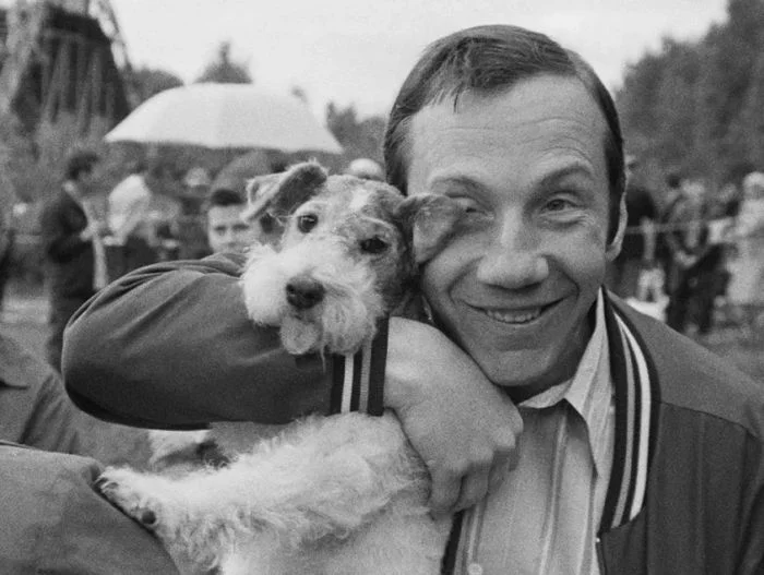 31. Леонид Гайдай среди советских и чехословацких студентов-гостей студии «Мосфильм», 1968 год