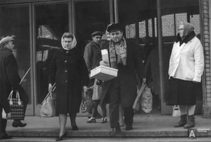 5. Евгений Леонов с покупками спускается по ступеням Усачёвского рынка. Москва, 1960-е