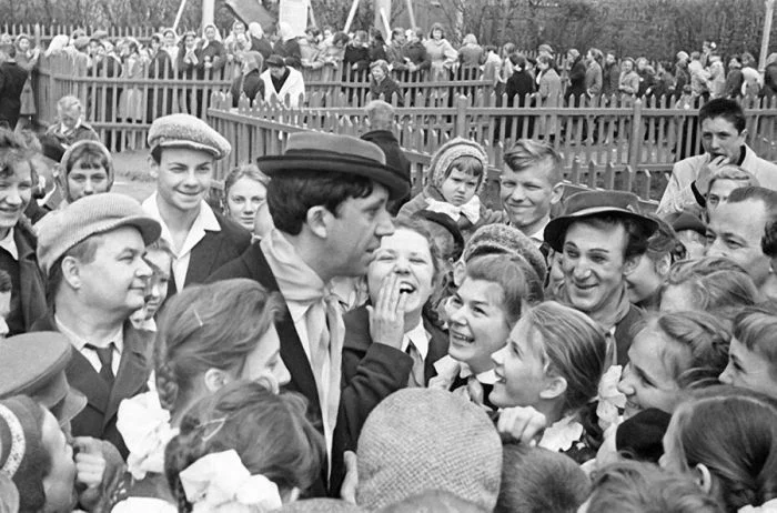 22. Юрий Никулин и Михаил Шуйдин во время встречи с зрителями, 1962 год