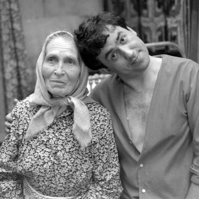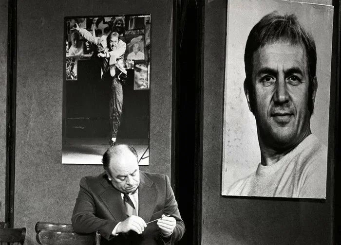 12. Леонид Броневой у фотопортретов актера, режиссера Льва Дурова в театре на Малой Бронной в Москве, 1977 год