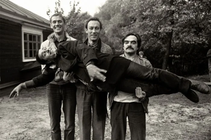6. Александр Абдулов, Олег Янковский и Александр Адабашьян держат на руках режиссёра фильма «Храни меня, мой Талисман» Романа Балаяна, 1986 год.