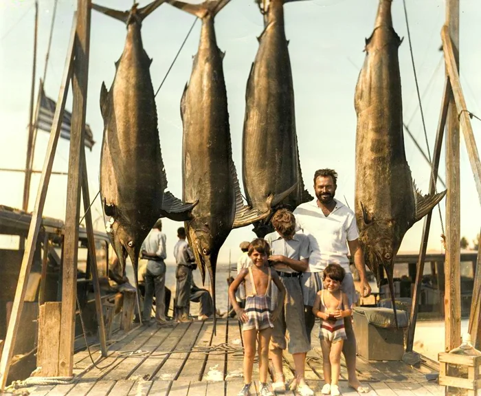 Эрнест Хемингуэй с тремя сыновьями и голубыми марлинами, Багамы, 1935 год.