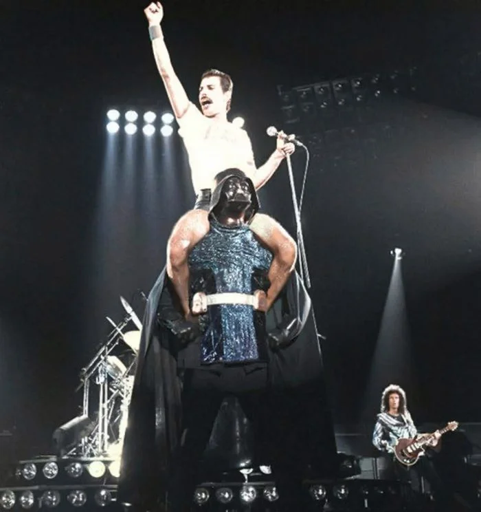 Фредди Меркьюри, лидер группы Queen, на плечах Дарта Вейдера, Хьюстон, 10 августа 1980 года.