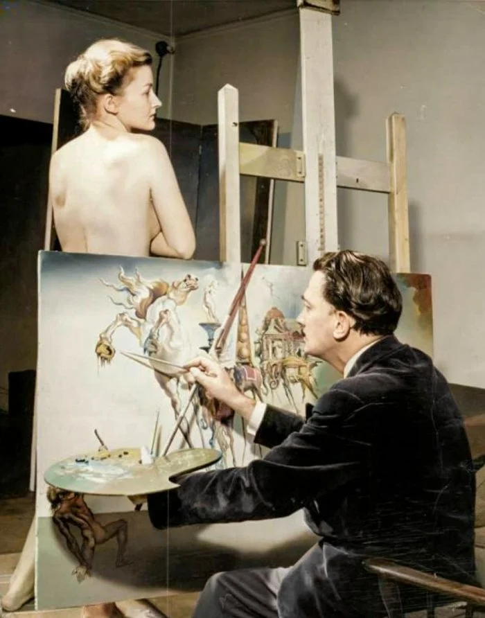 Сальвадор Дали и натурщица, 1946 год. Он трудится над картиной «Соблазн Святого Антония», которая теперь находится в Королевском музее Бельгии.