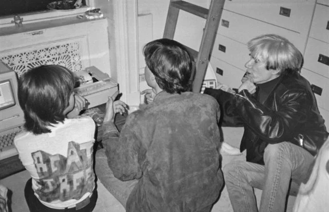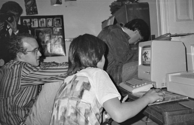Настоящие раритетные и уникальные фотографии, на которых Стив Джобс обучает Энди Уорхола, Кита Харинга и Кенни Шарфа пользоваться компьютером Macintosh. Этот компьютер был подарен Шону Леннону, сыну Джона Леннона и Йоко Оно, в честь его дня рождения 9 октября 1984 года.