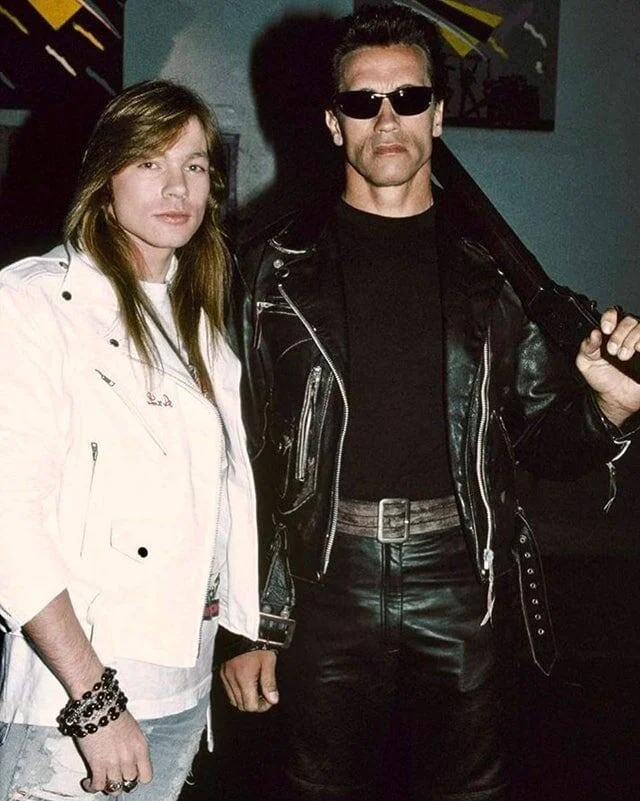 4. Эксл Роуз, солист Guns N’ Roses, и Арнольд Шварценеггер на съёмках видео «You Could Be Mine», 1991 год