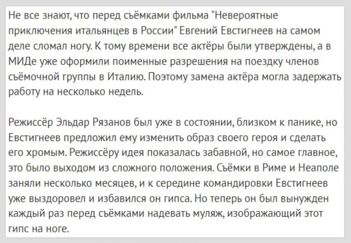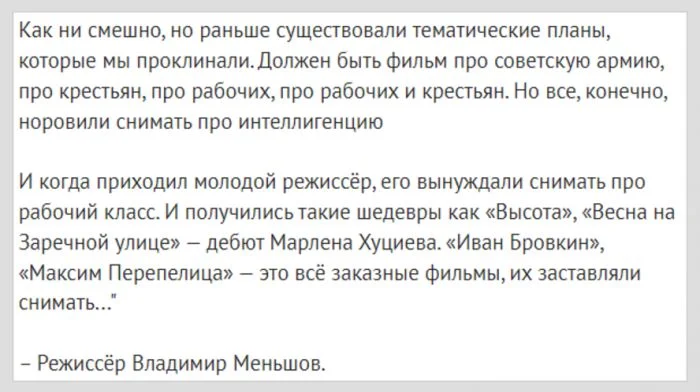 13. Надежда Румянцева о премьере фильма «Девчата» в Аргентине: «Начался просмотр, пришли зрители. Фильм в переводе назывался Girls, и все ждали, что будет шоу. И вдруг снег, эти ушанки, эти огромные сапоги, пилы. Я думаю: «Ну всe. В этой жаркой стране, в Аргентине, никто этого ничего не поймёт». И вдруг, как только я с Пуговкиным появилась, сначала тишина, а потом — хи-хи, а потом всё дальше и дальше такой хохот, что я уже думала: «Ну помолчите, вы же посмотрите дальше. Там ещё интересней будет, ещё лучше». И когда кончился фильм, на ложу, где была делегация, направили прожекторы, и зрители нам аплодировали. Так было приятно!»