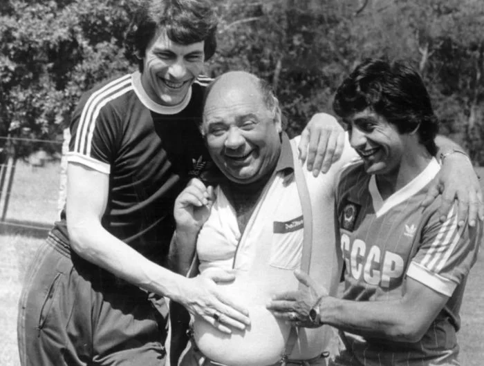 24. Евгений Леонов на базе сборной СССР с футболистами Ринатом Дасаевым и Хореном Оганесяном