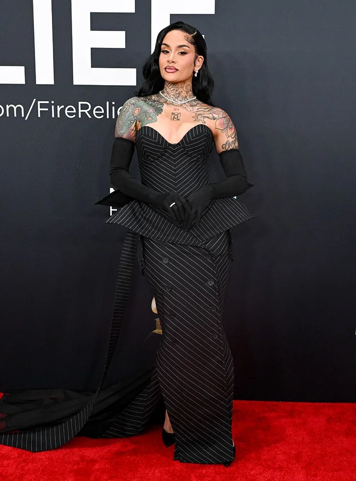 Кайли явилась на церемонию в образе панк-рокерши, выбрав кожаное платье с красными элементами. Её образ дополняли красные пряди.