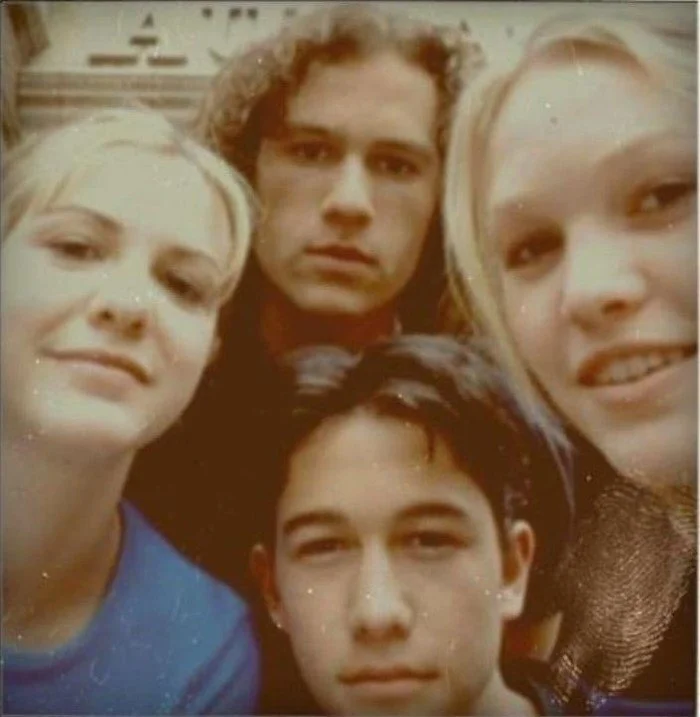 15. Хит Леджер, Джозеф Гордон-Левитт, Джулия Стайлз и Лариса Олейник делают снимок на Polaroid во время съемок фильма «10 причин моей ненависти»