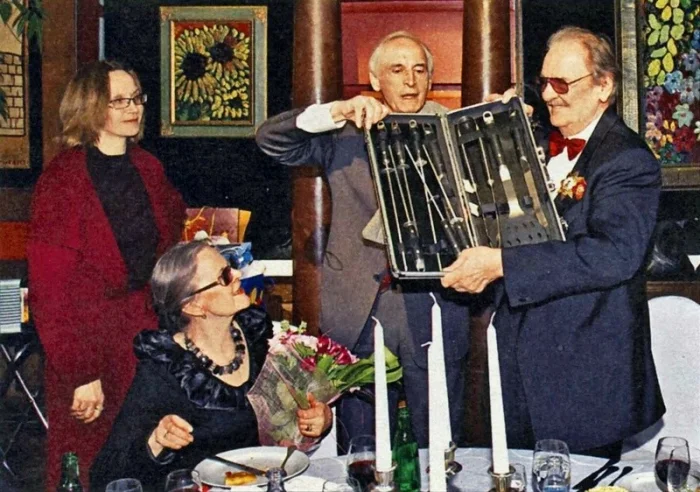 Свой юбилей Народный артист СССР сначала отпраздновал на сцене родного Театра имени Вахтангова, где в очередной раз при полном аншлаге сыграл в пьесе «Чайка». А вечером друзья и коллеги встретились с юбиляром в ресторане. Семейная пара Лановой-Купченко вышла поздравлять виновника торжества с закрытым чемоданчиком и пока произносили речи в честь юбиляра, все гости гадали, что внутри. Оказалось – набор для барбекю. Растроганный Юрий Васильевич принял подарок и пригласил всех присутствующих в зале к себе на дачу, на шашлыки. С букетом цветов за столом сидит супруга актера – Ирина Леонидовна Сергеева.