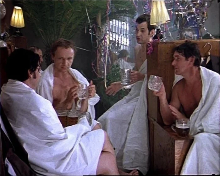 О том как снимали сцену в бане в фильме «Ирония судьбы, или С лёгким паром» вспоминал Александр Ширвиндт: "Эта история уже стала хрестоматийной. «Банные» сцены мы снимали поздней ночью в холодном павильоне «Мосфильма», а вовсе не в Сандунах, как многие думают. Из настоящей бани нам привезли лишь две бочки настоящего пива и пальмы в кадках. А поскольку было холодно, и был день рождения у Саши Белявского, каждый из нас принес с собой по бутылке сорокаградусной. Этими бутылками мы заменили бутафорские и сложили их к Жоре Буркову в портфель. Так что в кадре мы пили по-настоящему. Конечно, после очередного дубля мы здорово захмелели, и Рязанов, заметив это, съемку прекратил. На следующий день мы сыграли несколько дублей трезвыми. Однако в фильм попал тот, который отсняли именно в первую ночь!.."