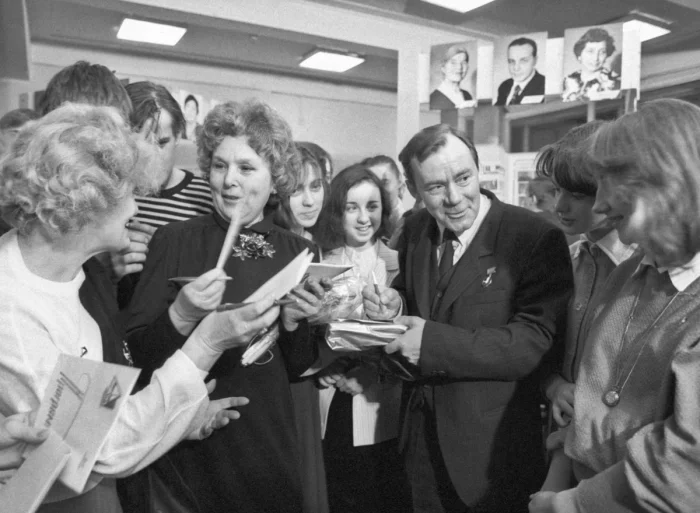 11. Вера Васильева и Валерий Носик раздают автографы на юбилейном вечере в Доме культуры завода ЗИЛ, 1987 год.