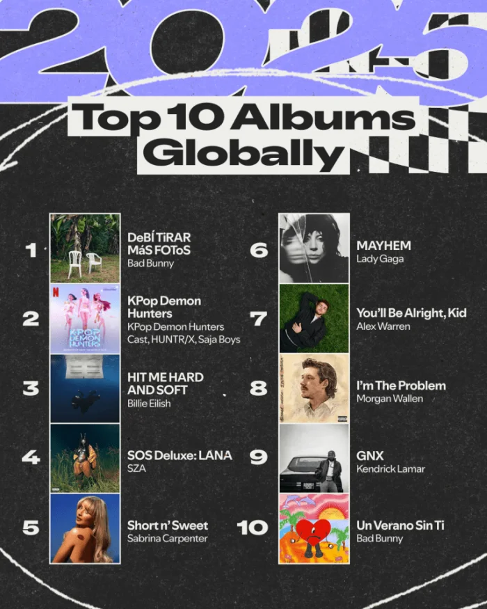 Самым популярным альбомом года стал «DeBÍ TiRAR MáS FOToS» Bad Bunny. Второе место занял саундтрек «Кейпоп-охотниц на демонов», а третье — пластинка Билли Айлиш «Hit Me Hard and Soft».