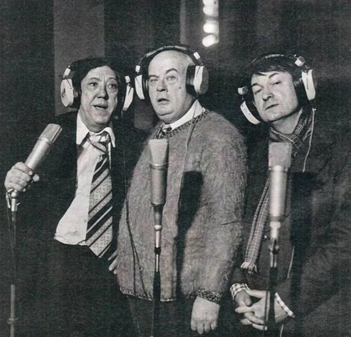 Юрий Никулин, Евгений Моргунов и Георгий Вицин во время озвучки персонажей Балбеса, Бывалого и Труса для аудиосказки «Происшествие в стране Мульти-Пульти», 1981 год.
