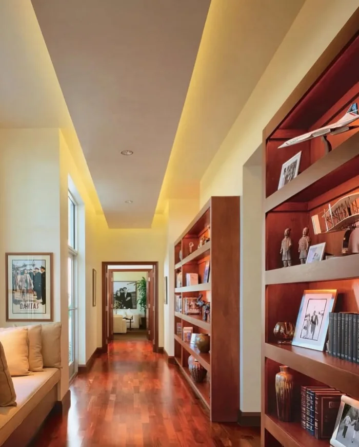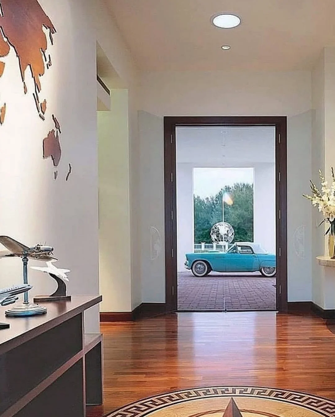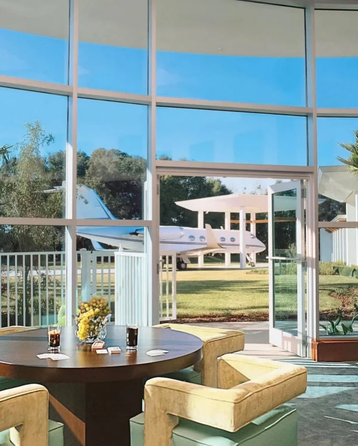 Интерьеры дома полностью отражают любовь владельца к авиации. Панорамные окна выходят прямо на взлётную полосу, а в оформлении можно заметить авиационные элементы, модели самолётов и тематические детали. При этом дом остаётся максимально комфортным: просторные гостиные, зоны отдыха, библиотека, бар, большие спальни и помещения для приёма гостей.