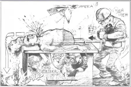 На двух картинках выше Вы видите секреты создания эффектов. Ходячая голова управлялась техниками, которые остались за кадром. В сцене с превращением Норриса участвовали сразу три техника, один из которых стоял за столом, а двое сидели под столом. Ни одного из них мы не видим, поэтому создаётся впечатление, что всё происходит по-настоящему.