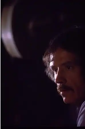 Джон Карпентер и член съёмочной группы в обгоревшем каркасе вертолёта