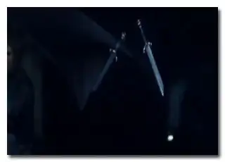 В финальной схватке V одновременно бросает два кинжала, которые образуют всё тот же знак: