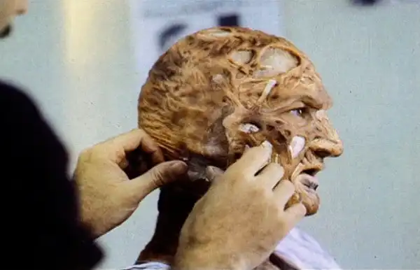 Кукольный бюст Фредди был построен для сцены, в которой с лица Крюгера стягивают кожу. Верхняя маска из латекса висела на черепе с мощью лубриканта KW Jelly, ее нельзя было приклеить намертво - ведь она должна была быстро сползти с куклы при прикосновении.