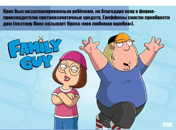 Еще факты: пес Брайан - это прообраз создателя сериала Сета Макфарела, из-за излишней тяги к алкоголю которого и прекратили снимать новые сезоны. Но Сет не растерялся и попробовал свои силы в кинематографе, став одним из создателей фильма "Тед", ну или "третий лишний" на русский мотив.