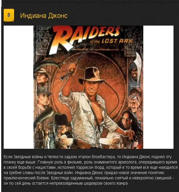 Смотрел давеча "Теорию большого взрыва", там была высказана мысль о том, что если убрать Индиану Джонса из фильма события имели бы практически один и тот же конец. Расстроился.
