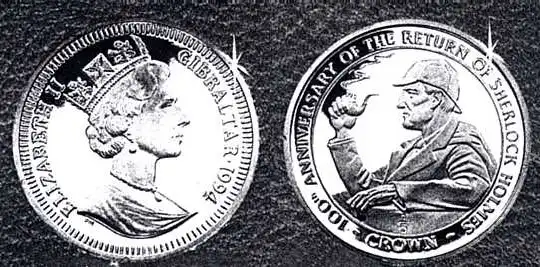 Например, в 1994 году в честь 100-летия воскрешения Холмса, после роковой схватки с Мориарти на Рейхенбахском водопаде, Гибралтар выпустил серию "Шерлок Холмс, самый известный детектив мира" из восьми монет с надписью на реверсе "100-я годовщина возвращения Шерлока Холмса"