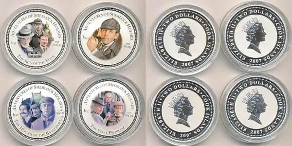 В 2007 году, в ознаменование 120-летия создания Артуром Конан Дойлом дебютной повести о Шерлоке Холмсе, частная компания «Новозеландский монетный двор» выпустила мемориальную серию из четырёх монет номиналом в два новозеландских доллара каждая. Монеты отчеканены для новозеландского владения — Островов Кука из серебра 999 пробы в количестве 8 тысяч экземпляров. Вес каждой монеты составляет 31,1 грамма (1 унция). Чеканка — матово-глянцевая с цветной фотопечатью на поверхности.