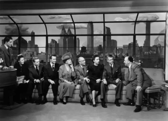 Седрик Хардвик, Альфред Хичкок, Джеймс Стюарт и Эдит Эвансон на съемках фильма «Веревка»
