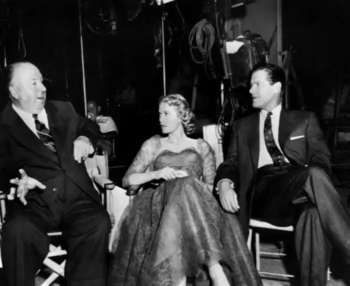 1954. Альфред Хичкок, Грейс Келли и Роберт Каммингс на съемках «В случае убийства набирайте М.»