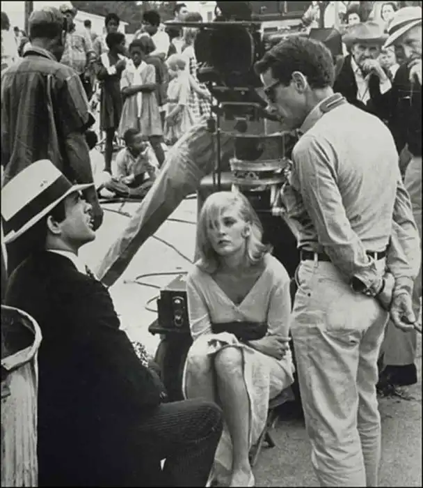 1967. Артур Пенн (справа) беседует с Уорреном Битти и Фэй Данауэй между дублями на съемках «Бонни и Клайда»