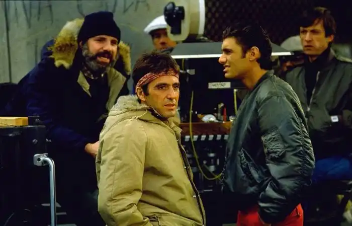 1983. Брайан Де Пальма, Аль Пачино и Стивен Бауэр на съемках фильма «Лицо со шрамом»