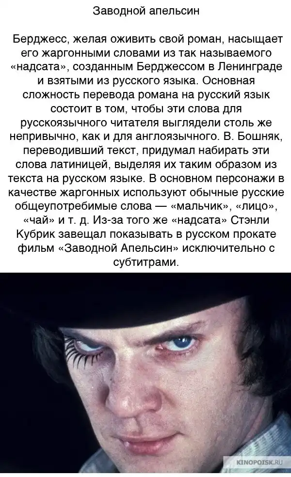 Есть одна байка про "Заводной Апельсин". Бёрджесс приехал в Ленинград, сочинять свой надсат, и решил посетить тюрячку. Администрация тюрячки строго настрого запретила заключённым использовать в разговоре с писателем нецензурные слова. А теперь попробуйте представить, как заковыристо ругались бы герои книги, если этого запрета не было?
