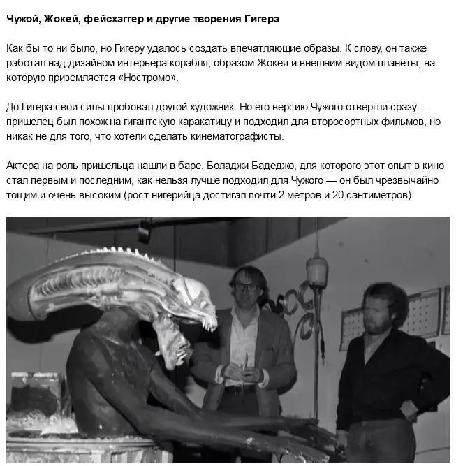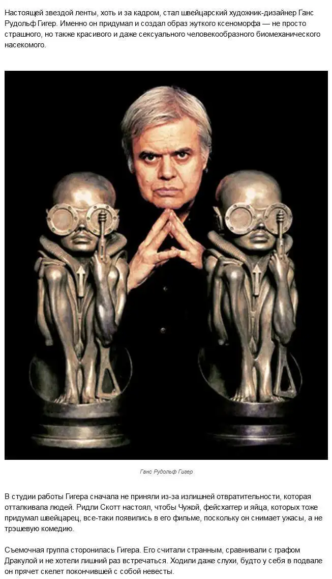 В конце 70х годов прошлого века на большие экраны впервые вышел кинофильм "Чужой", который до сих пор пугает зрителей похлеще многих современных ужастиков и триллеров. Пожалуй, история о затерянном в далеком космосе корабле "Ностромо" будет еще много лет считаться одним из самых удачных фильмов ужаса. Поэтому я предлагаю вам почитать далее несколько интересных фактов о том, как снимался этот киношедевр под названием "Чужой", который был снят в 1979 году.