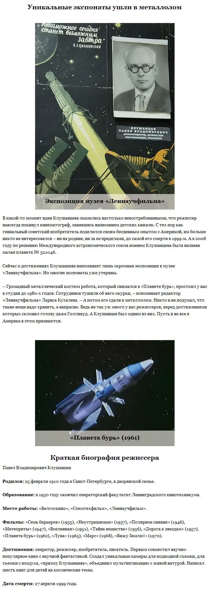 Яркие спецэффекты известных голливудских фильмов надолго остаются в памяти зрителей, и они всегда видят в этом заслугу режиссеров и других людей, работавших над кинолентой. Однако это не всегда так, ведь спецэффекты могут копироваться. Предлагаем вашему вниманию самые зрелищные спецэффекты, которые изначально были придуманы советским режиссером Павлом Клушанцевым, а потом уже появились в американских фильмах.
