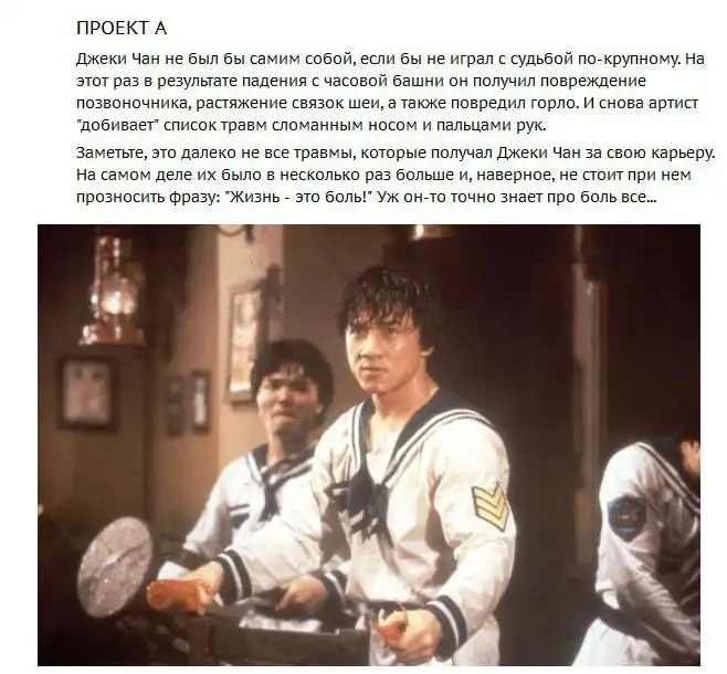 7 апреля хорошо известный и любимый российским зрителем китайский актер Джеки Чан отметил свой 61-й день рождения. Мы не будем говорить о том, как прошел праздник, а лишь расскажем вам о травмах, которые в разные годы своей жизни актер получил на съемочных площадках. Большая часть травм представляет угрозу для жизни человека, а потому остается неизвестным, как вообще мастер боевых искусств сумел дожить до данного возраста.