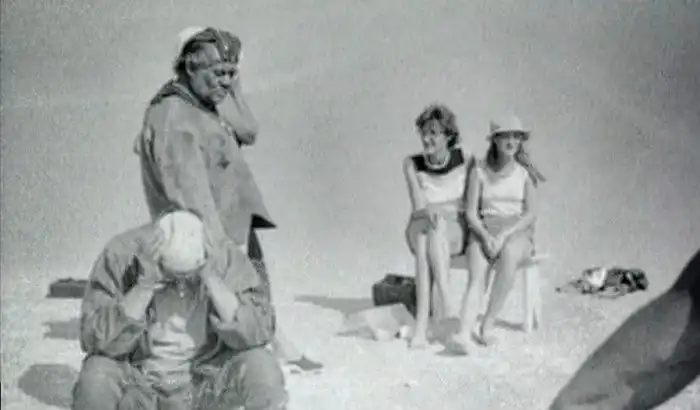 Приехали. Главной декорации «Пепелац» — нет (как я уже писал, её отправили во Владивосток). Колесо обозрения, которое где-то раздобыл замдиректора Сережа Сендык, еще не поставили. Декорация «Катер» не готова. Комбинированные кадры нельзя снимать — нет пультов управления. А на съёмку уже приехали: Станислав Любшин — ведущий актер МХАТа, Евгений Леонов — ведущий актер «Ленкома» и Юрий Яковлев — ведущий актер Театра имени Вахтангова. Главные режиссеры этих театров пошли навстречу и освободили артистов. Но только на месяц. Месяц кончается, все актеры здесь, а снимаются только проходы и пейзажи. Нужные и ненужные. Жара, градусов, наверное, шестьдесят.