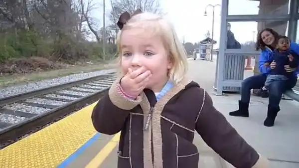 Смешная девочка ждет прибытия поезда