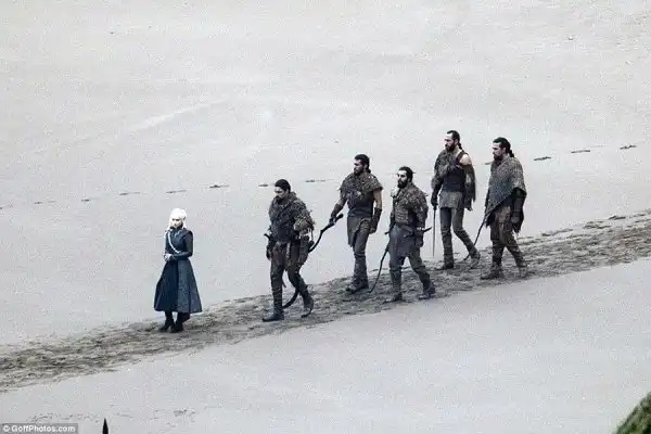 Он прибывает на Драконий Камень с Давосом. У них забирают лодку и оружие, а встречает их Тирион. В 3 эпизоде он уже встречается с Дени. В тронном зале с Дени дотракийцы, которые вроде как ее Королевские Гвардейцы.