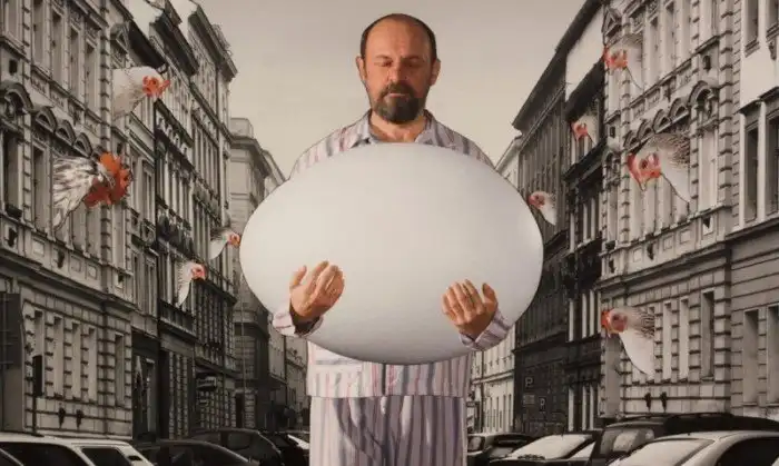 Евгений - стареющий женатый мужчина, который ведет двойную жизнь. В бодрствующем состоянии он проводит счастливые часы в компании супруги, с которой живет рука об руку уже много лет. Как только он погружается в сон, то теряет связь с реальностью и становится жарким поклонником воображаемой женщины его мечты. Каждый его сон представляет эротическую фантазию с участием этой прекрасной молодой особы в красном одеянии. В своем стремлении перенести сонные фантазии в настоящую жизнь он обращается к психоаналитику, который по-разному пытается интерпретировать фантасмагорическое состояние своего пациента.