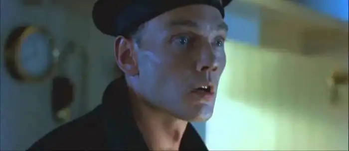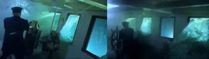 Один из драматичных моментов: мощный поток воды разбивает окна капитанского мостика. Во-первых, часы между вторым и третьим окнами загадочно исчезают, а во-вторых: окна разбиваются, вроде бы, по-порядку, однако на следующем кадре справа - третье немного отстает от остальных.