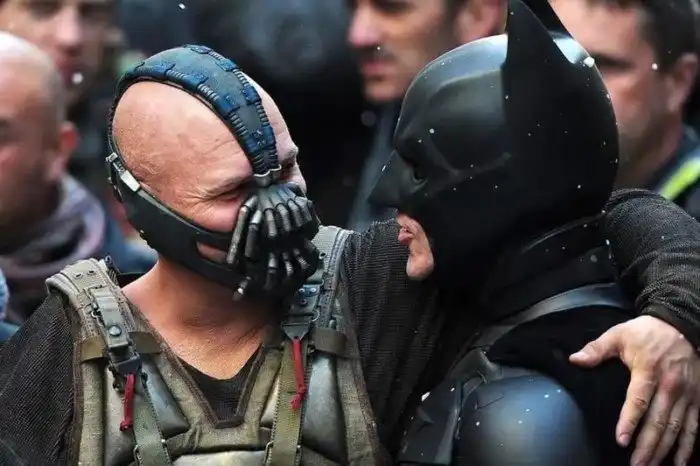 Такие фотографии напоминают нам, насколько убедительными могут быть действительно хорошие актеры. В перерыве между сражением не на жизнь, а на смерть, Кристиан Бэйл и Том Харди спокойно обменивались дружескими шутками и объятьями, после чего возвращались к супергеройскому поединку Бейна и Бэтмена.