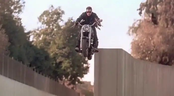 В канал на «Харлее» вслед за грузовиком прыгает Т-800. Здесь Арнольда Шварценеггера подменил дублер, мотоцикл же и вовсе никуда не прыгал — его плавно опустили на тросах. Тросы затем удалили с помощью компьютера, с его же помощью сцене придали нужную динамику. Аналогичным образом снимался еще один похожий момент, когда Т-1000 «планирует» на полицейском мотоцикле с окна «Кибердайн Системс» на вертолет. К слову, во время съемок следующего эпизода ради эффектности происходящего пришлось разбить три «вертушки» и столько же фургончиков, на которых Сара и компания удирают от разбушевавшегося робота.