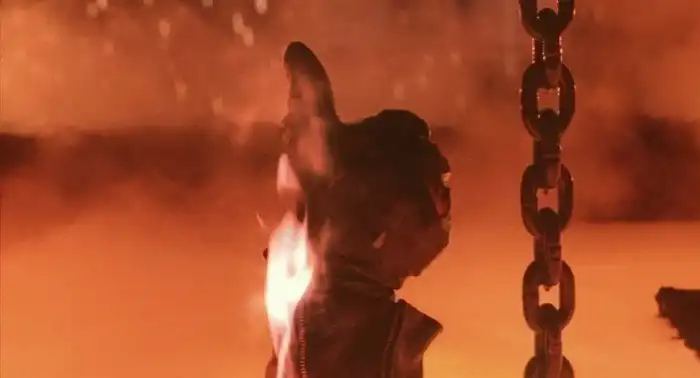 Режиссер был готов пойти на все, чтобы впечатлить зрителя, даже если речь идет о совсем крохотном эпизоде, который запросто можно в буквальном смысле проморгать. Заключительная четверть фильма, над «Кибердайн Системс» барражирует вертолет, Т-1000 запрыгивает в него с мотоцикла, разбивает стекло и перетекает в кабину, после чего металлическое воплощение киборга в течение какой-то секунды произносит в адрес пилота фразу «Get out».