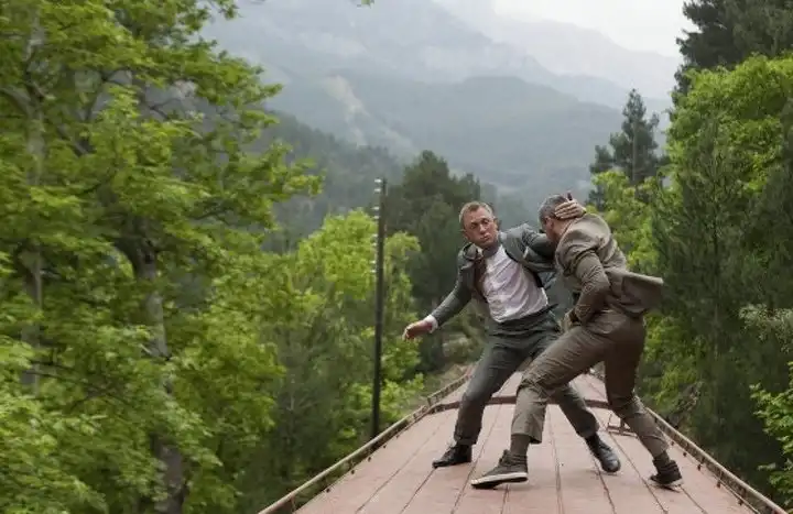 Актер Дэниэл Крэйг действительно отказался от дублера и выполнял трюки сам на крыше движущегося поезда. Ну чем вам не настоящий Джеймс Бонд?